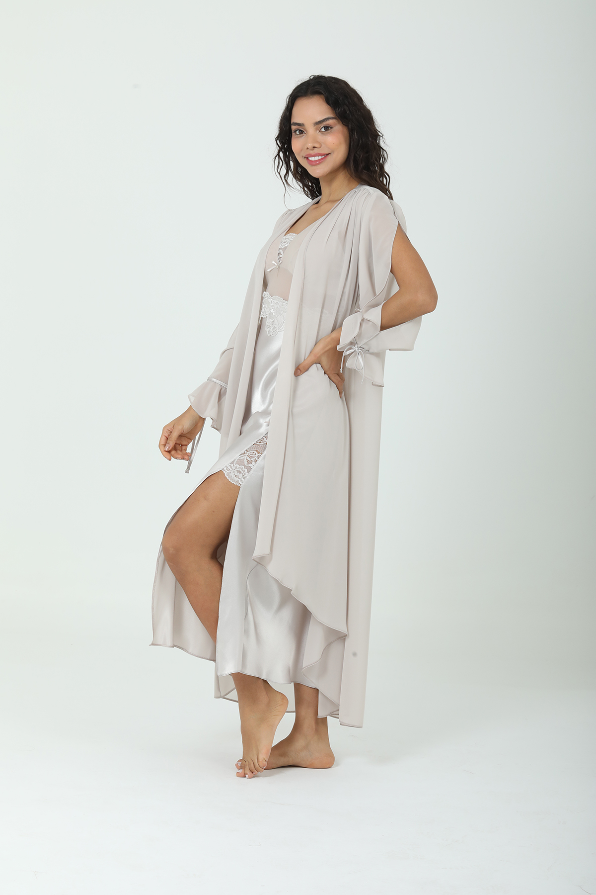 Uzun Saten Gecelik ve Şifon Sabahlık Takımı – Asil Seri VİZON